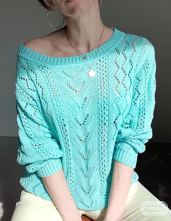 Джемпер выполнен из пряжи 80% хлопка и 20% шелка с толщиной нити 400м на 100гр на спицах 2,75мм. Расход 270 грамм. Связан снизу вверх. Рукава втачные с окатом.