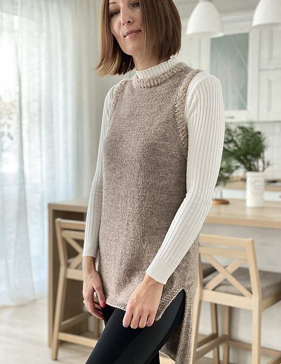 Основной узор изделия – лицевая гладь. Безрукавка вяжется без швов, регланом-погоном сверху. Проймы и горловина отделаны буклированной пряжей. Оригинальная пряжа: Gazzal Peru alpaca, Drops Alpaca Boucle.